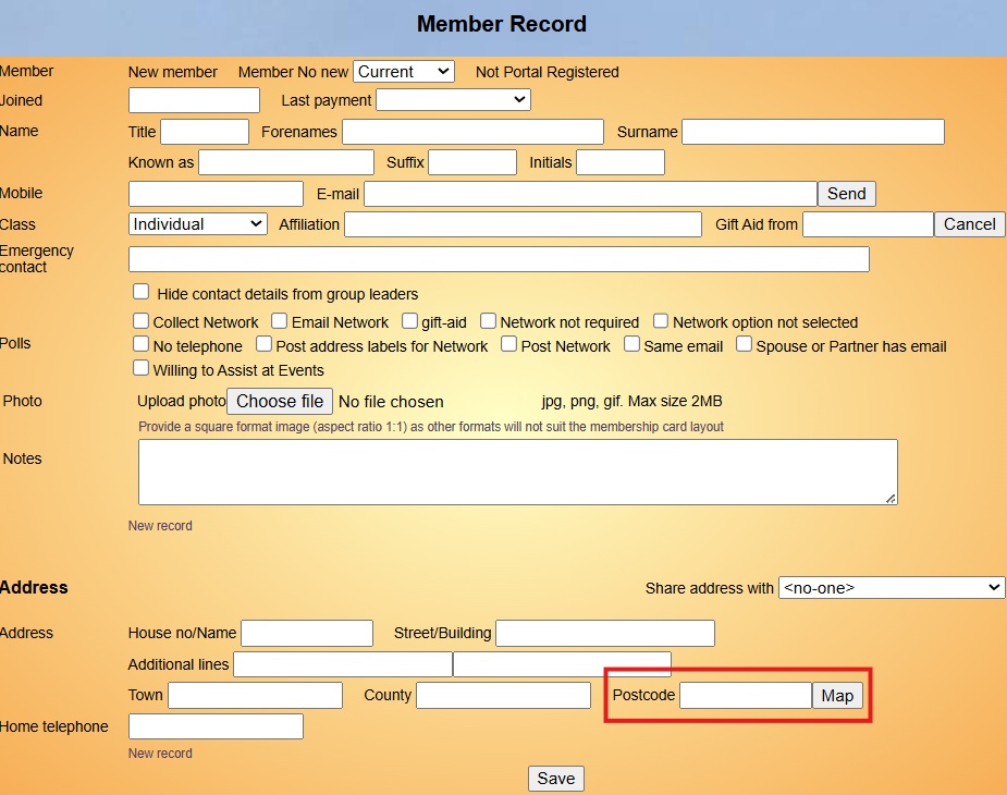 An example of where the map button can be found is shown, highlighted in red, on the Member Record below.