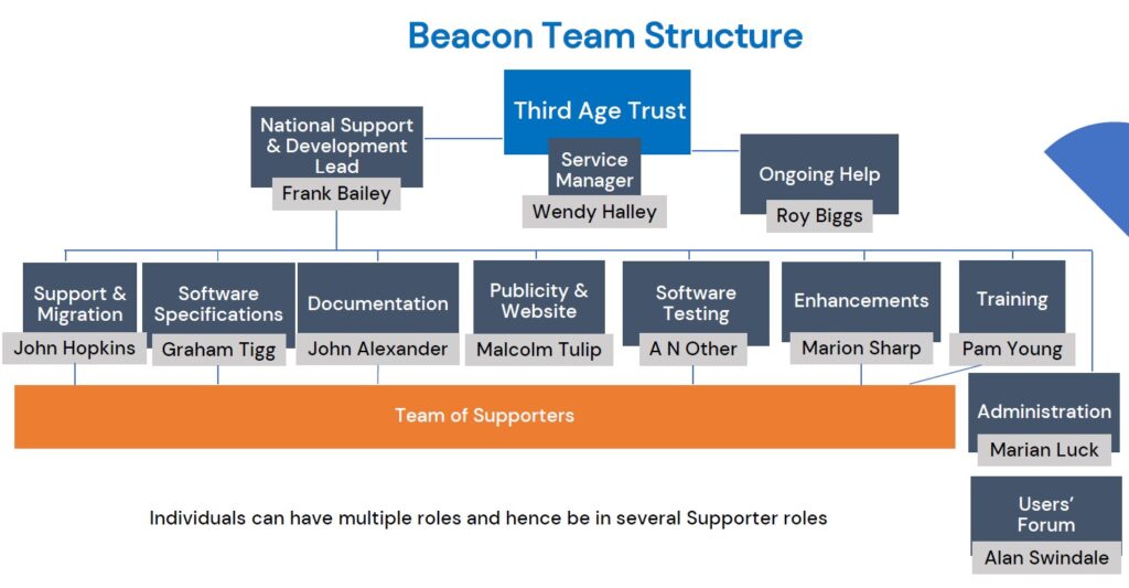 I coordinate the Beacon Enhancement Team which reviews and prioritises all the change requests from individual u3as. The Enhancement Team liaise with the developers to ensure that all changes are tested before being implemented. We also ensure that all the documentation is kept up to date.